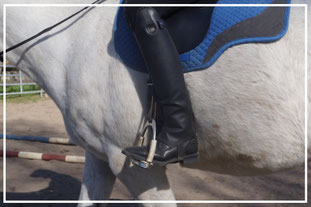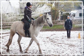 Ich mache kleine Übungen mit den Reitern und fange erst an der Longe an. Der Reiter lernt als ersten Grundschritt das entspannte Sitzen auf dem Pferd. Folgend werden die gezielten Einsätze der Hände/Arme und Beine und des Gewichts wieder aufgebaut.